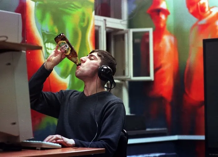 Парень пьёт пиво «Золотая бочка» в интернет-клубе «Нирвана». Москва, 2000 год.