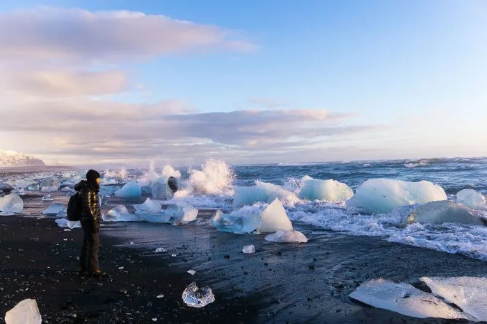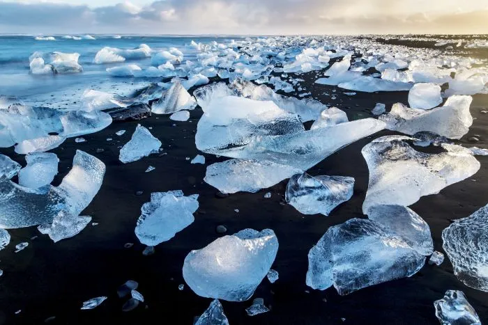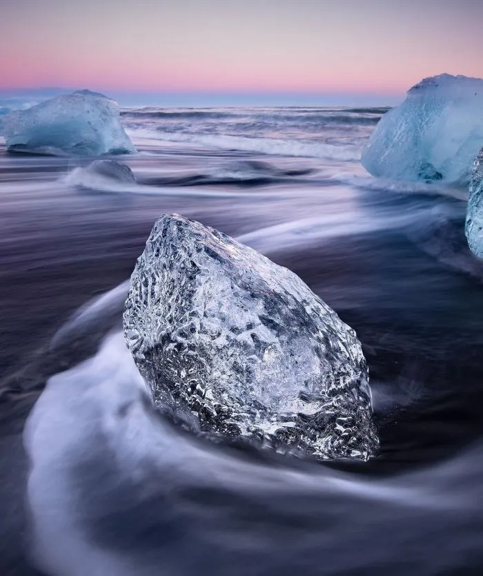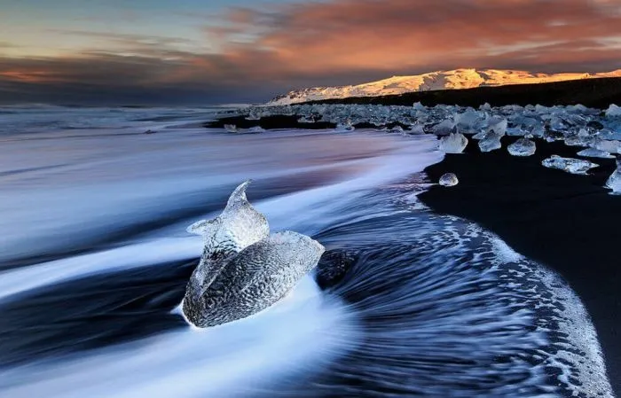 Удивительный пляж Даймонд-бич, облик которого меняется чуть ли не каждый день, находится в Исландии неподалёку от ледника Брейдамеркурйокюдль и ледниковой лагуны Йёкюльсаурлоун.