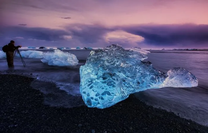 Ледник постепенно подтаивал, и откалывавшиеся от массива фрагменты разной формы и размера всплывали на поверхность, потом двигались по направлению к лагуне и попадали на пляж.