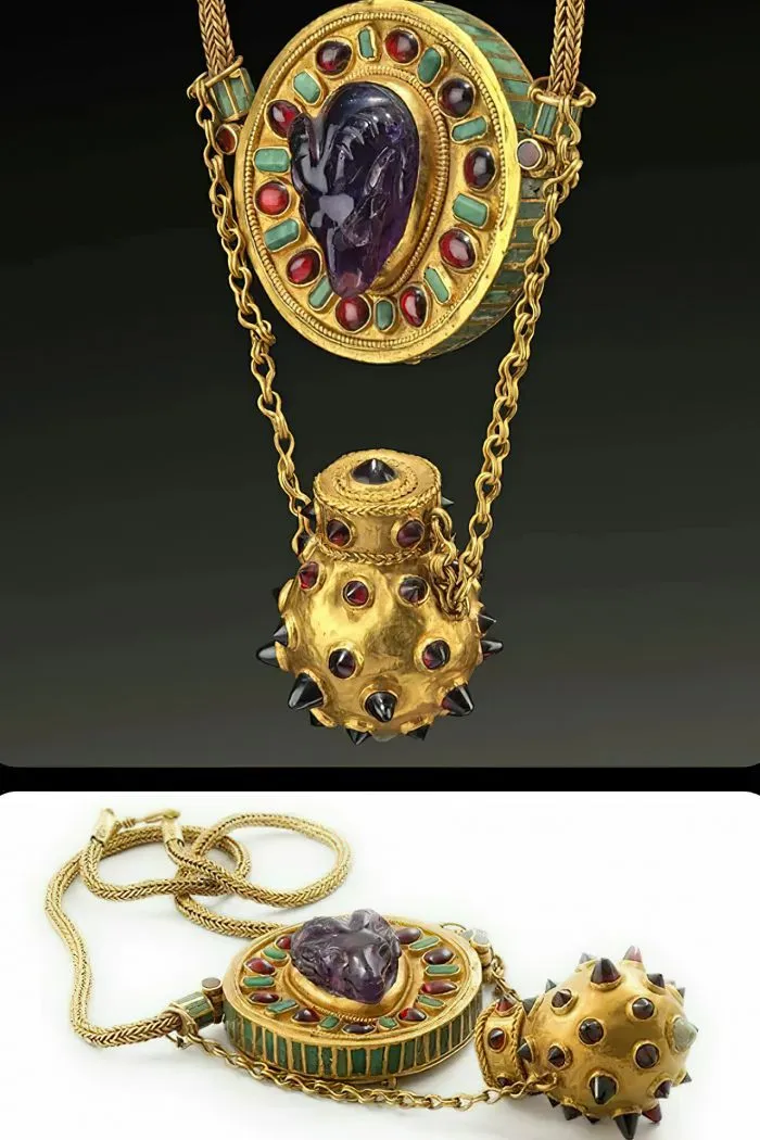 5. Ожерелье из Грузии, ок. 100–200 гг. н. э.: футляр для амулета с головой барана из аметиста, флакон для духов, украшенный гранатами, цепочка из золота