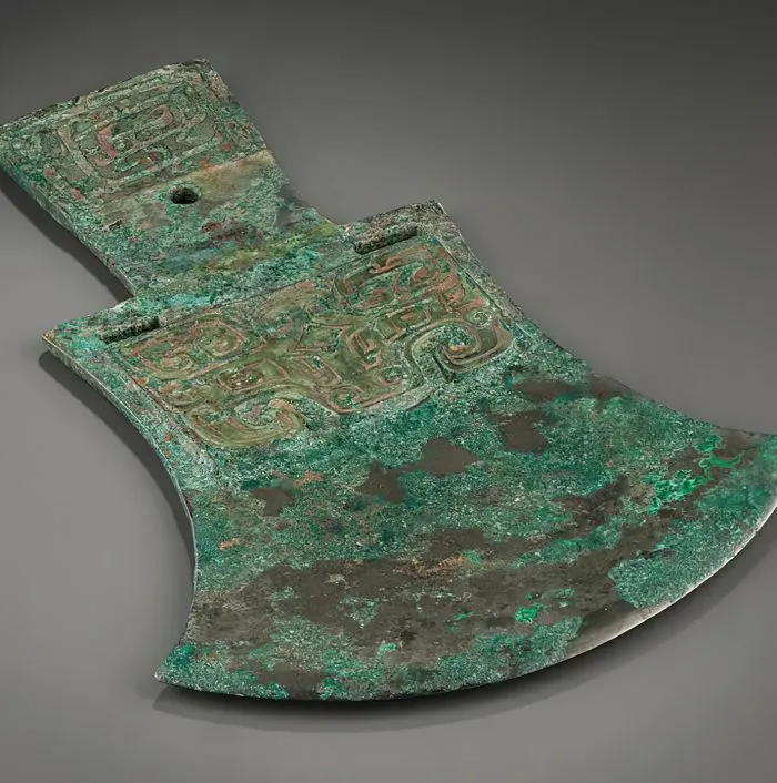 14. Бронзовый топор с узором, изображающим таоте — легендарное чудовище. Китай, династия Шан, 13-11 вв. до н. э.