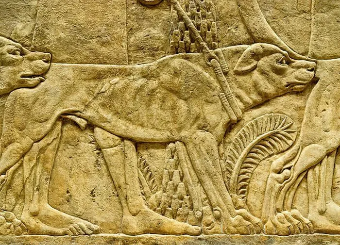 22. Рельеф с изображением охотничьей собаки, Ассирийская империя, ок. 645 г. до н. э. Северный дворец Ниневии. Ритуальная охота царя Ашшурбанипала (годы правления 668 — ок. 627 до н. э.)