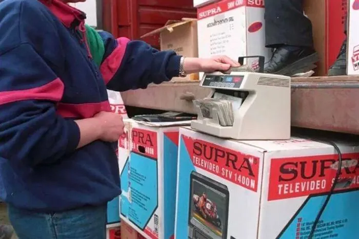 8. Продавец пересчитывает деньги перед продажей видеодвойки на рынке, 1990-е
