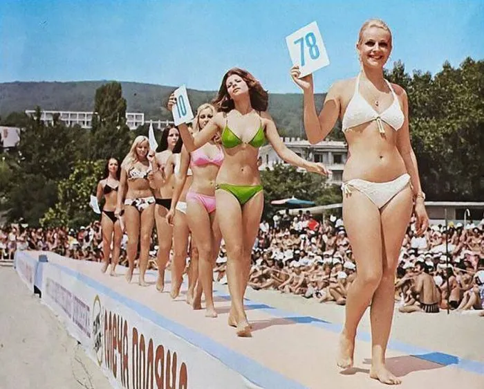 37. Девушки в бикини проходят по подиуму на конкурсе красоты. Золотые Пески, Болгария, 1974 год