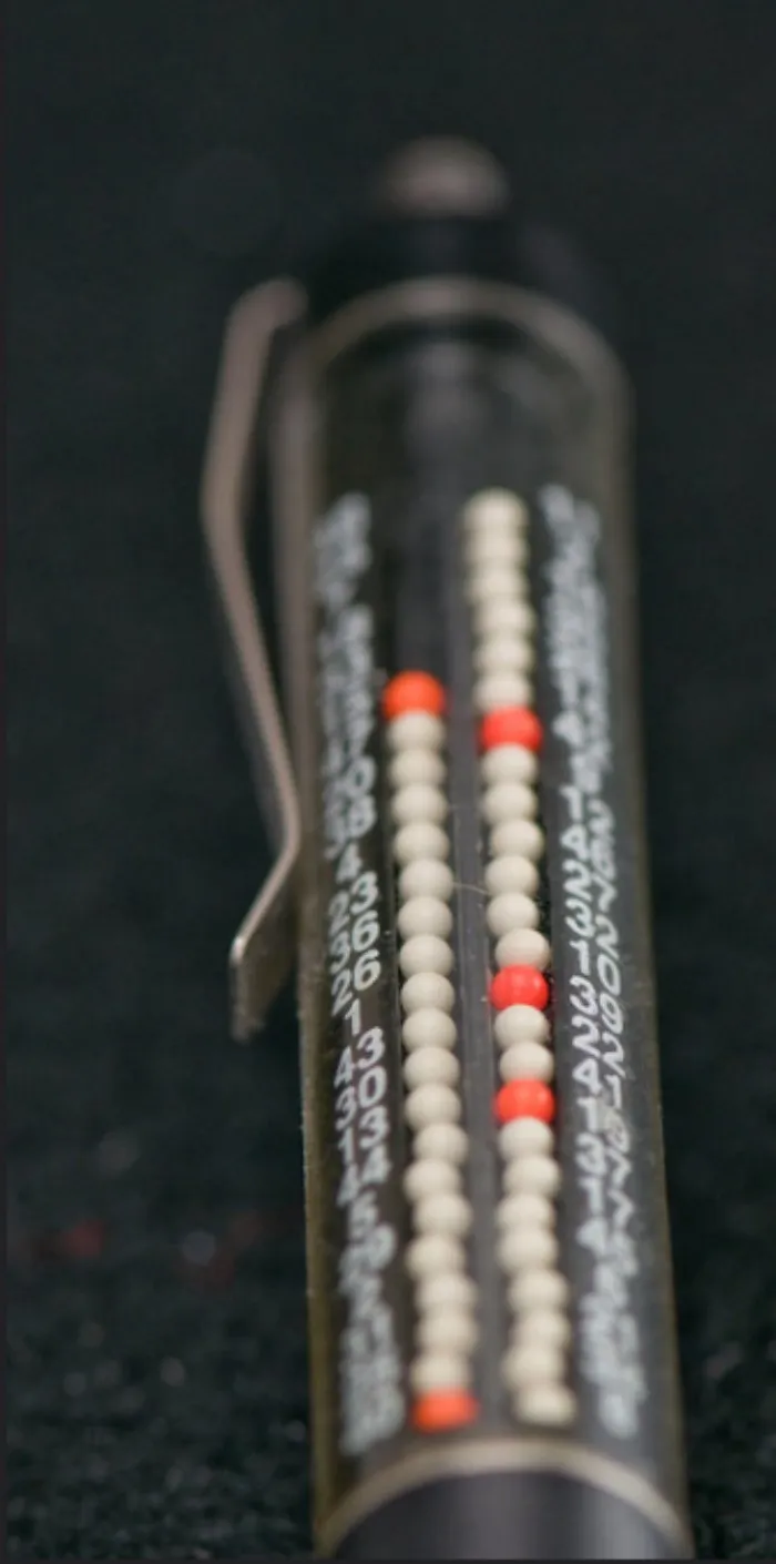 Это лотерейная ручка. Суть работы - потрясти ее, и посмотреть, на какие номера попадут шарики иного цвета, после чего выбрать их в лотерее 6 из 45. Вот похожая ручка, правда, один из красных шариков не показан, а может, у них и лотерея другая.