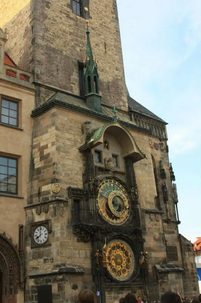 На ратуше установлены куранты, которые состоят трех частей: в верхней части астрономических часов каждый час проходит представление движущихся фигур двенадцати апостолов, в центре расположен астрономический циферблат, а под ним — календарный циферблат. Пражские куранты — это настоящее чудо техники, они точно указывают время, дату, день недели, астрономические циклы, положение Солнца, фазы Луны и праздники христианского календаря.