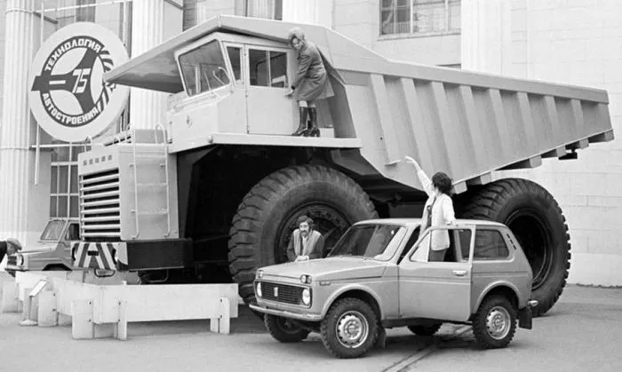 9. Прототип Нивы ВАЗ-2121М и карьерный самосвал БелАЗ, 1975 год