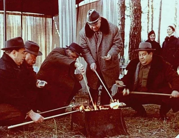 11. Леонид Брежнев вместе с соратниками жарят хлеб и сало на костре, середина 1970-х