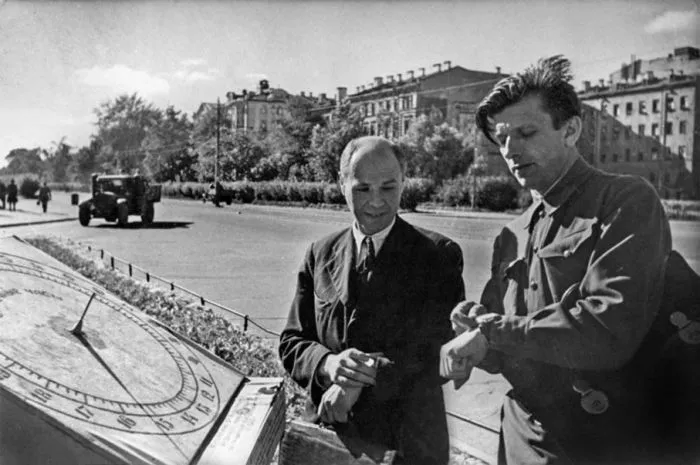18. У солнечных часов на Большом проспекте Васильевского острова, 1943 г. Фотограф Рафаил Мазелев