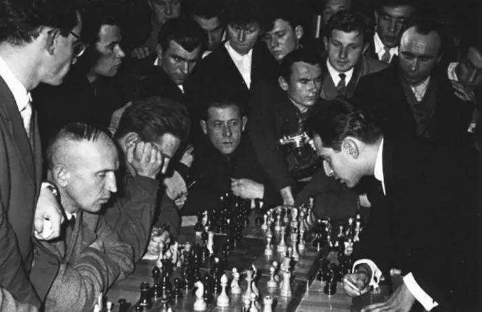20. М. Таль даёт сеанс одновременной игры шахматистам. Минск. Автор Савин Михаил, 1960 год