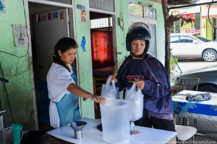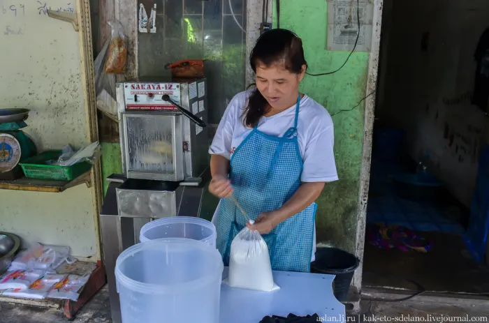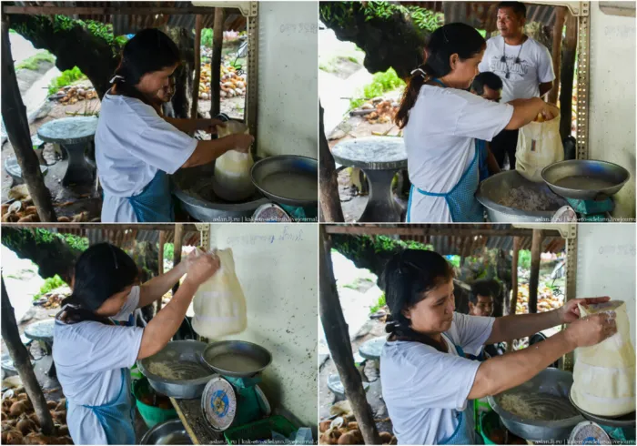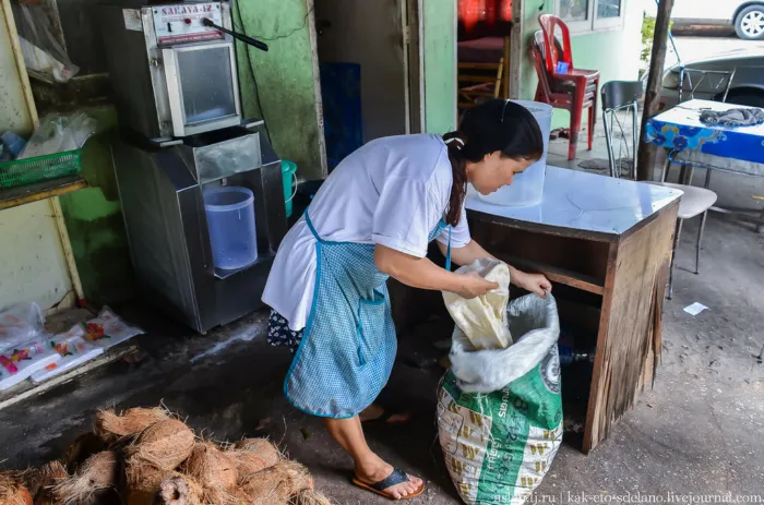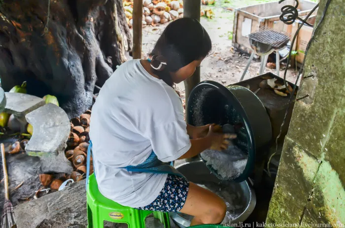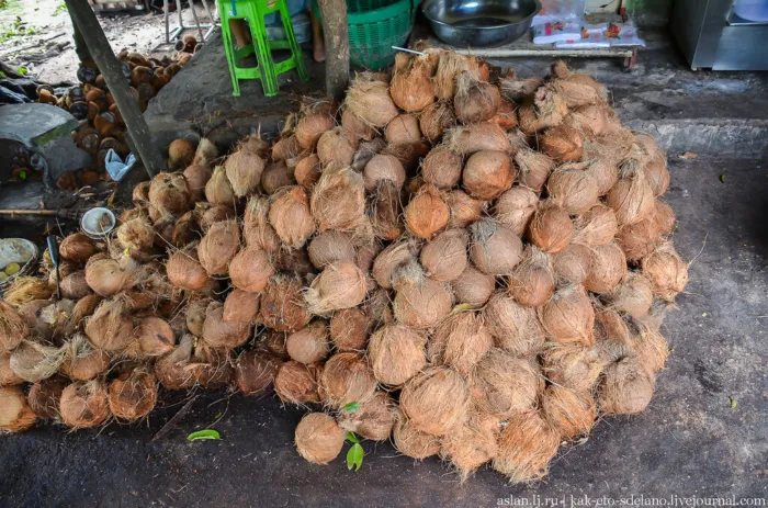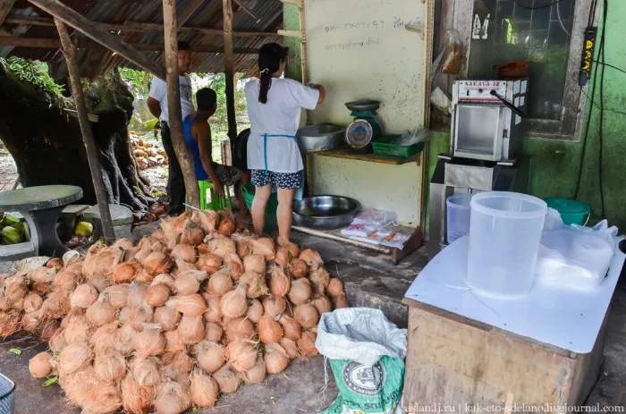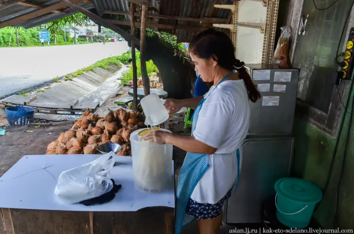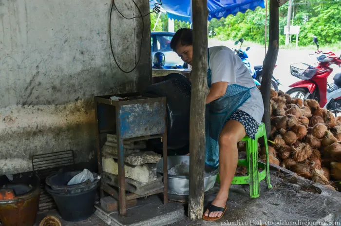 Моя работа - смотреть как другие работают. Из всех виденных мною процессов производства этот отличается от остальных своей чрезвычайной простотой. Это не то же самое, что добывать молоко от коровы или другого млекопитающего, это совсем другое, но давайте посмотрим своими глазами весь процесс добычи кокосового молока на Пхукете.