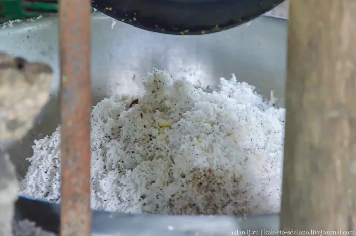 При необходимости, если оператор кокосовыжимательного аппарата считает, что молока в ведре мало, добавляет воды в мешок с кокосовой стружкой.