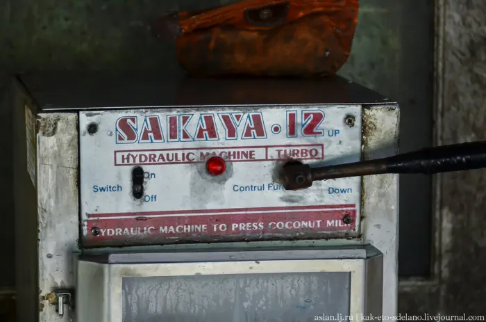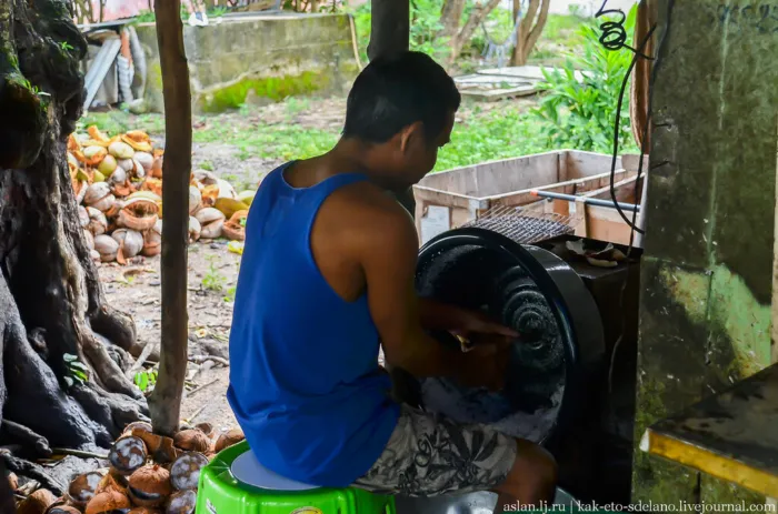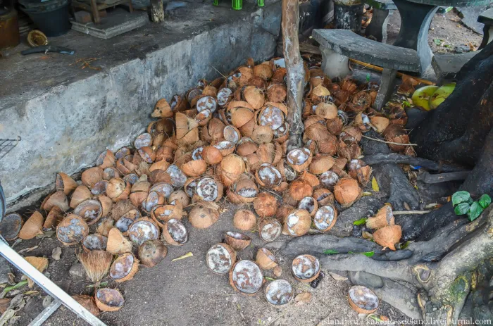Оказалось, что в этом дворе делают кокосовое молоко. Для этого сперва нужно снять кожуру с ореха, потом расколоть его на две половинки. После чего на специальном аппарате выскоблить мякоть.