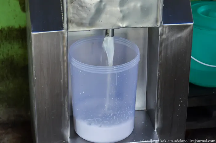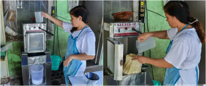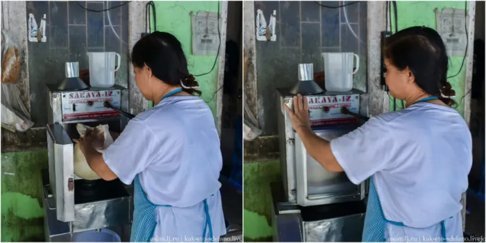 После чего мешок с водой помещают в аппарат для выжимания кокосового молока. Да, именно так он и называется