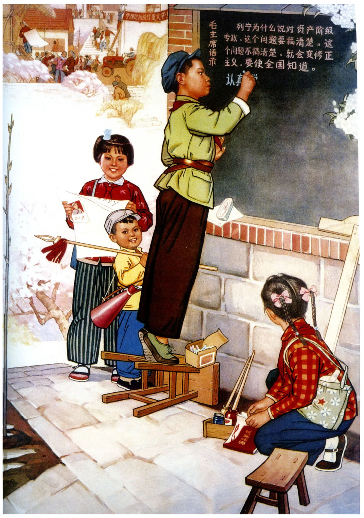 (Кстати, знаете, что малец там пишет? Не поручусь за стопроцентный перевод, но вроде того что: Почему Ленин говорит, что мы должны добраться до корня вопроса о диктатуре капитализма? Потому что, если мы не доберёмся до корня, - это будет трансформацией ревизионизма”. Зато дети позитивные. Ну, и все остальные тоже.