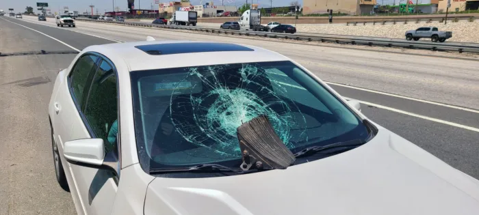Это противооткатная колодка для автомобиля. Ставится под колесо, мешает автомобилю откатиться. Как она прилетела в лобовуху, черт ее знает 0_0.