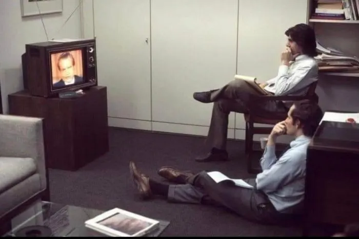 6. Репортеры, разоблачившие Уотергейтский скандал, наблюдают за отставкой президента Никсона, 1974 год