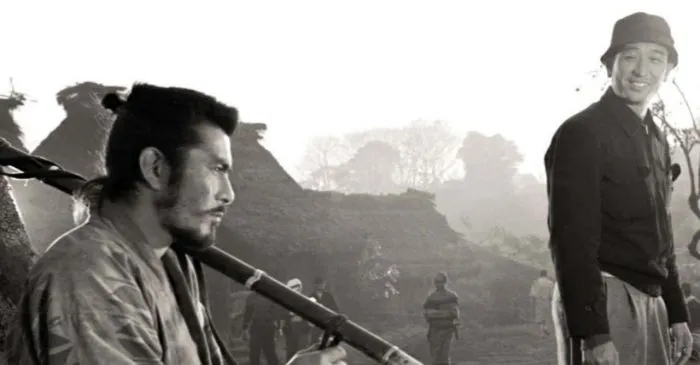 29. Актер Тосиро Мифунэ и режиссер Акира Куросава на съемках фильма "Семь самураев", 1954 год