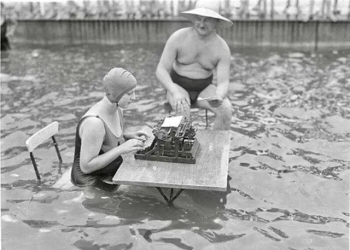 21. Немецкий предприниматель и секретарь работают в бассейне во время сильной жары. Берлин, Германия, 1926 год