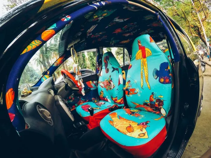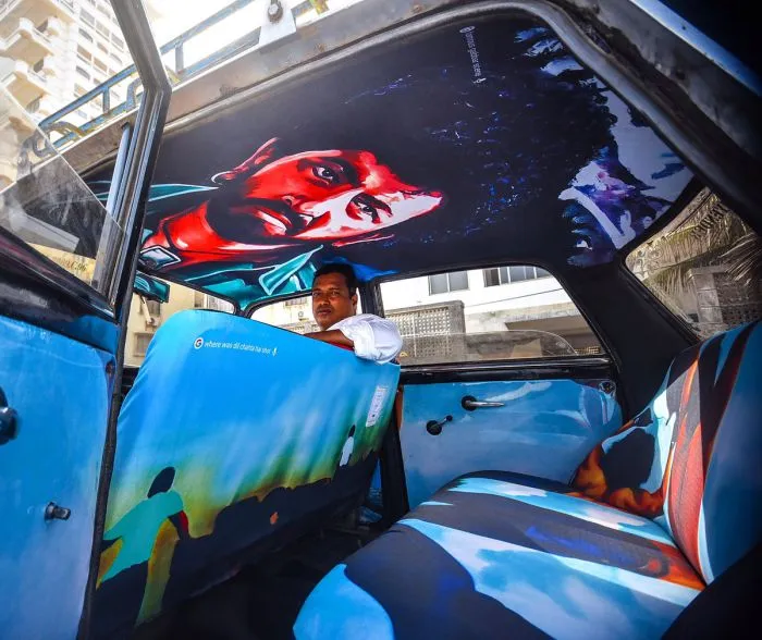Талантливый художник может из самой привычной вещи сотворить произведение искусства. В индийском городе Мумбаи команда дизайнеров «Taxi Fabric» превращает обычные такси в настоящие арт-объекты.