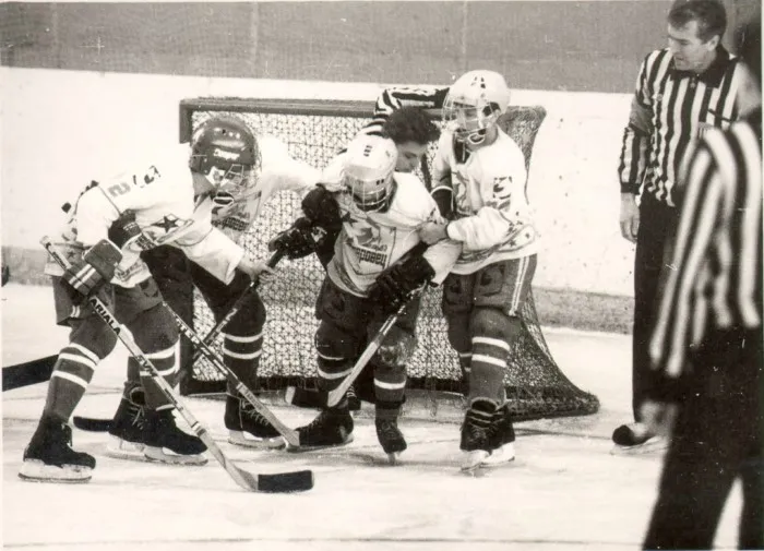 Момент игры. Команда чемпионов СССР на приз ЦК ВЛКСМ «Золотая шайба» подросткового клуба «Гайдаровец» города Хабаровска в Барнауле. 1990 год