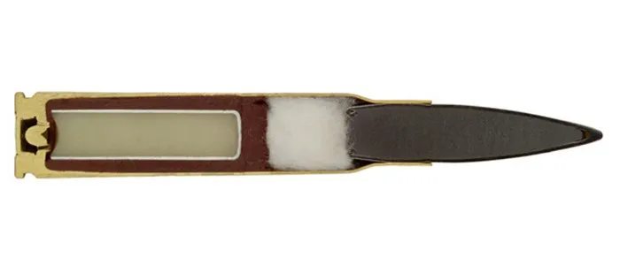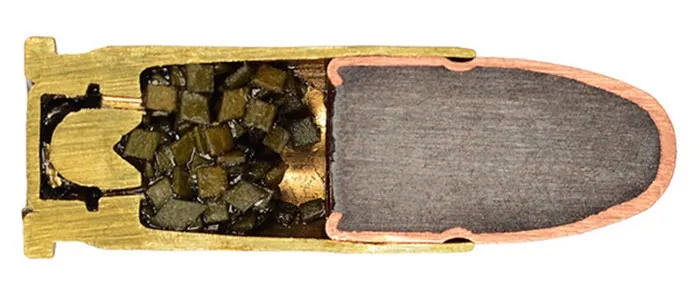 Пуля оболочечная, медная «рубашка» защищает свинцовую пулю от деформации.