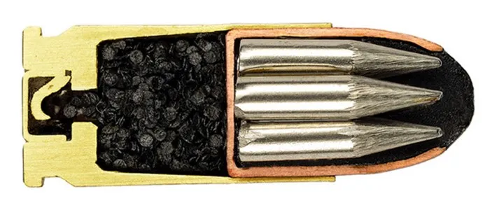 Специальный патрон 7,62/5,6 мм Salvo Squeezebore с тремя латунными пулями. Предназначен для особого оружия: задняя часть ствола у него нарезная цилиндрическая, а передняя — коническая, гладкая. В нарезной части все три пули движутся под действием пороховых газов как единое целое, но в коническом его участке пули обжимаются, задние при этом вытесняются из передних и из ствола вылетают уже порознь. Из-за обжатия пуль калибр указывается через дробь, поскольку вначале пуля имеет калибр 7,62 мм, а в процессе движения по каналу ствола он уменьшается до 5,6 мм. И вот такие трансформеры придумали еще в 1970-е годы!