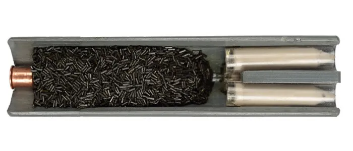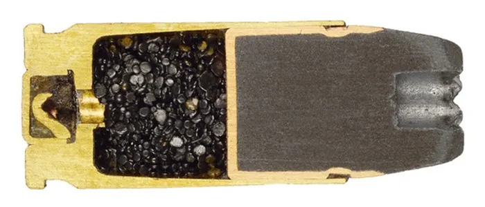 При попадании пуля разрушается, поражая не защищенного бронежилетом противника снопом дроби.
