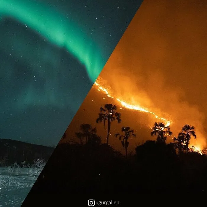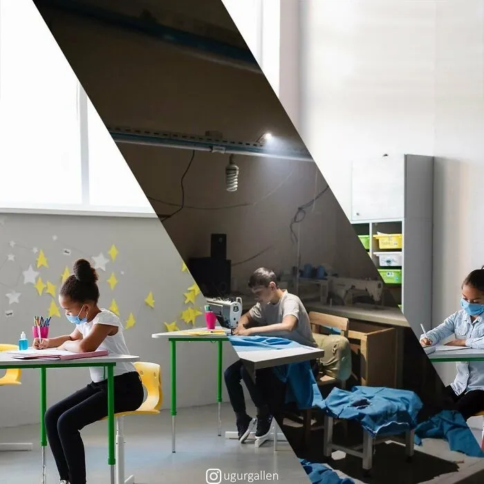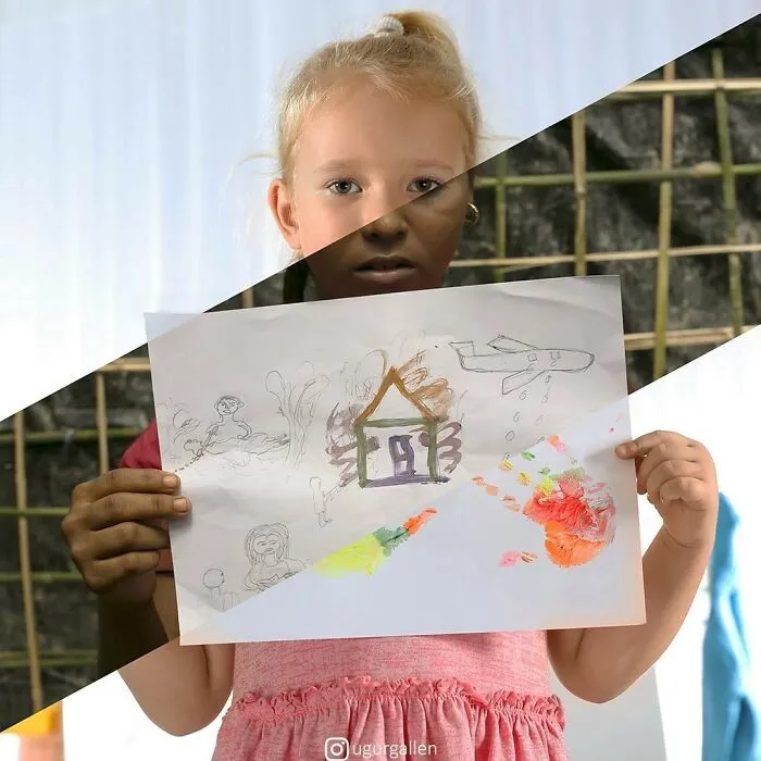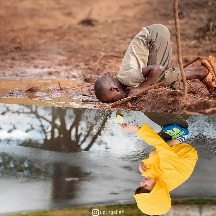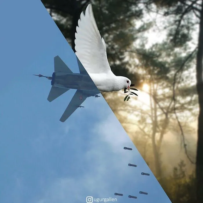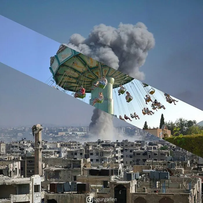 "Я стремлюсь показать социальные проблемы, которым подвержен наш мир, такие как несправедливость, война, изменение климата и т.д., путем сопоставления двух фотографий в одном кадре. В своих работах я иллюстрирую контрасты между двумя разными мирами, в которых мы живем, и побуждаю задуматься о принятии решений, которые позволят минимизировать эти проблемы", - говорит Угур.