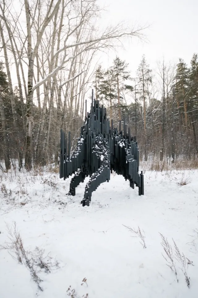 Инсталляция поднимает больную тему лесных пожаров, которую подчёркивают использованные материалы: старые деревянные доски, которые хранят в себе память родных лесов и тепло человеческих жилищ.