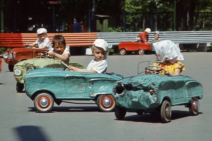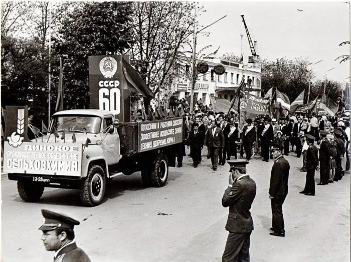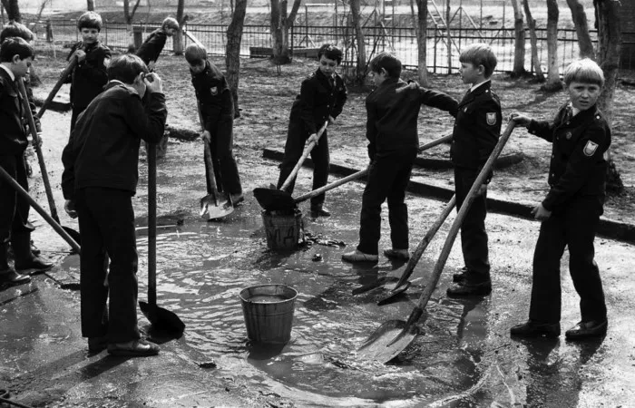 Вычерпывание лужи перед первомаем. Новокузнецк 1987 год.