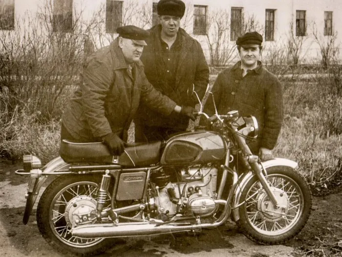 Мужики в ватниках демонстрируют построенную новую опытную модель мотоцикла "Урал" :) Б.В. Зефиров и работники экспериментального участка ОГК ИМЗ с экспериментальным мотоциклом М 67-Э. Ирбит ИМЗ 1974 г.
