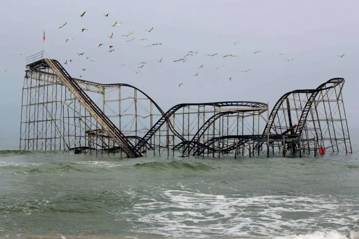 4. Американские горки Jet Star стояли на пирсе в Сисайд-Хайтс, штат Нью-Джерси, но после урагана Сэнди их затопило
