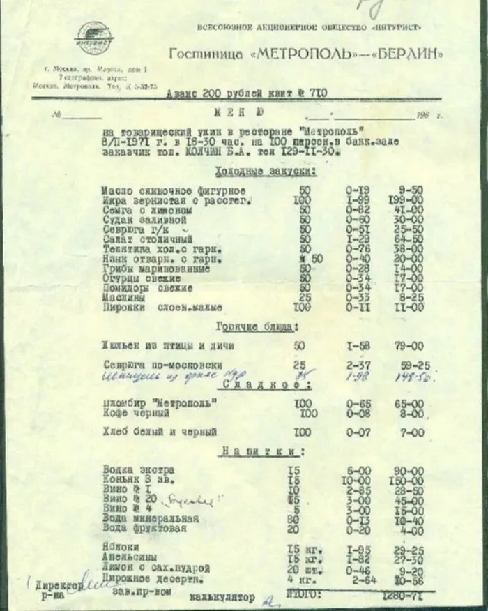 Сколько стоил товарищеский ужин в ресторане "Метрополь" на 100 человек в 1971 году? Попался вот такой интересный документ: Меню на товарищеский ужин Колчина Б.А. в ресторане “Метрополь” г. Москвы 8 февраля 1971 г. на 100 персон. Читаем изучаем)) Как выяснилось Колчин Б.А. был знаменитым ученым и как раз в конце 1970 года получил государственную премию, возможно это меню с торжественного застолья по этому поводу.
