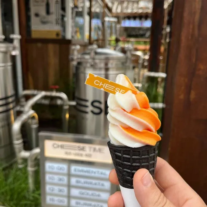 Ничего необычного, просто мороженое, сделанное из трёх видов сыра: гауда, эмменталь и буррата. Очень мягкий, нежный и сливочный десерт.