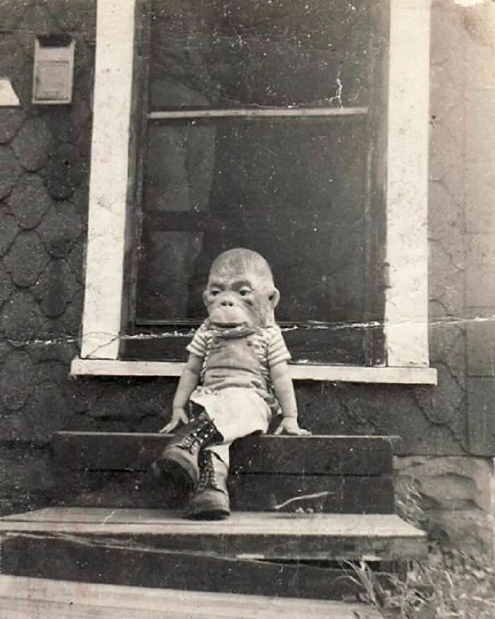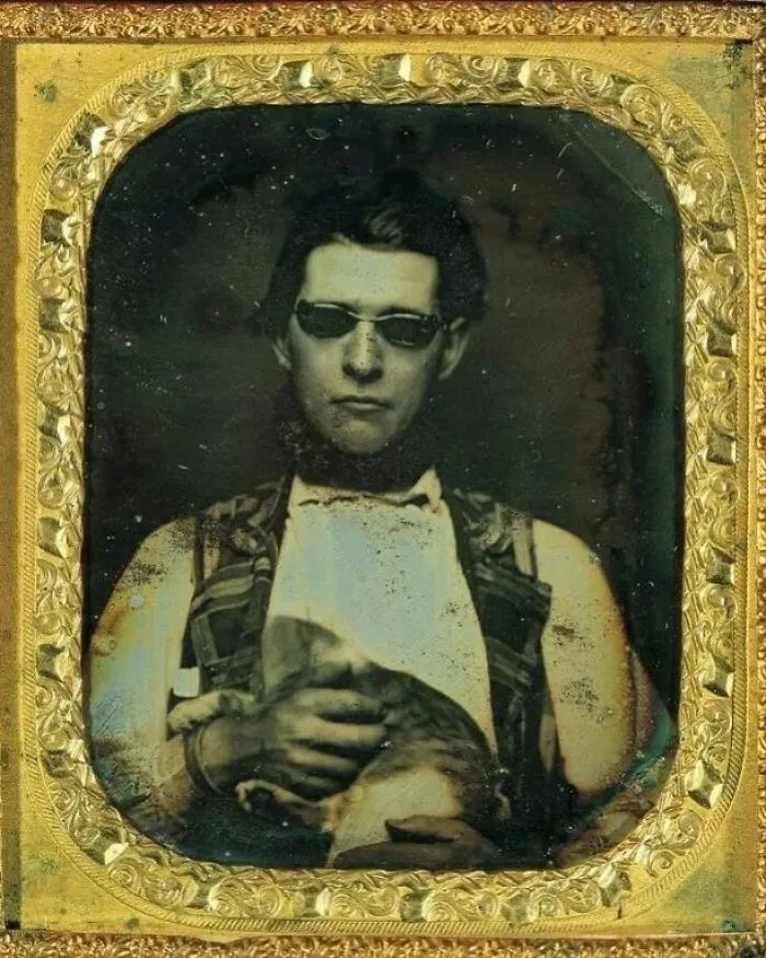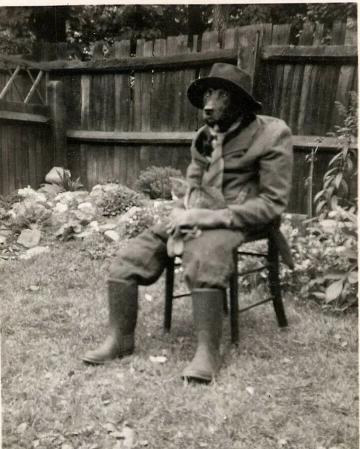 10. Собака, одетая в костюм, с котенком на коленях, 1950-е