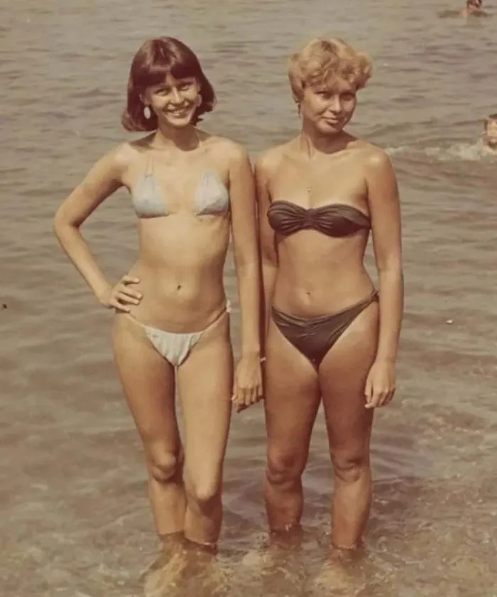 12. Двадцатиоднолетняя будущая актриса Ирина Бахтура (затем Ливанова, затем Безрукова) (слева) с подругой на пляже, 1986 год