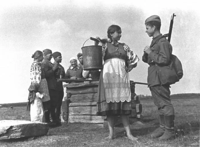 23. Девушка и солдат у колодца. БССР, 1944 год
