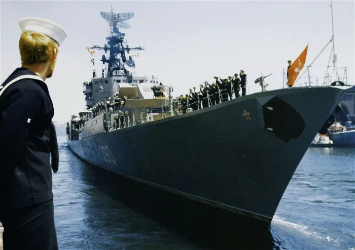 30. Моряк ВМС США наблюдает, как советский БПК "Бойкий" выходит из порта. Бостон, Массачусетс, май 1975 года