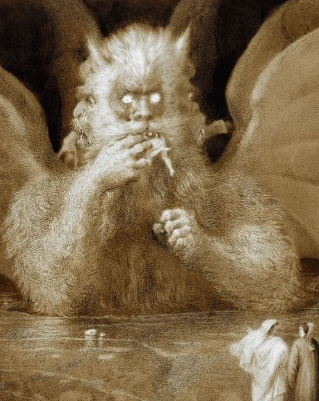На картине изображён падший ангел, который не смог перебороть зло внутри себя и сам превратился в зловещего беса, пожирающего всё на своём пути. Во время написания работы художник вдохновлялся сценами страшного суда, которые так любили живописцы средневековья и эпохи Возрождения.