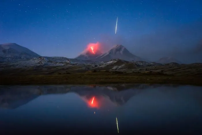 10. Фотограф запечатлел метеорит во время извержения вулкана