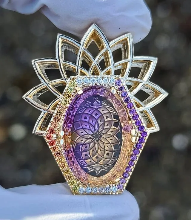 Для изготовления кулона использовались аметрин, аметисты, сапфиры и бриллианты.