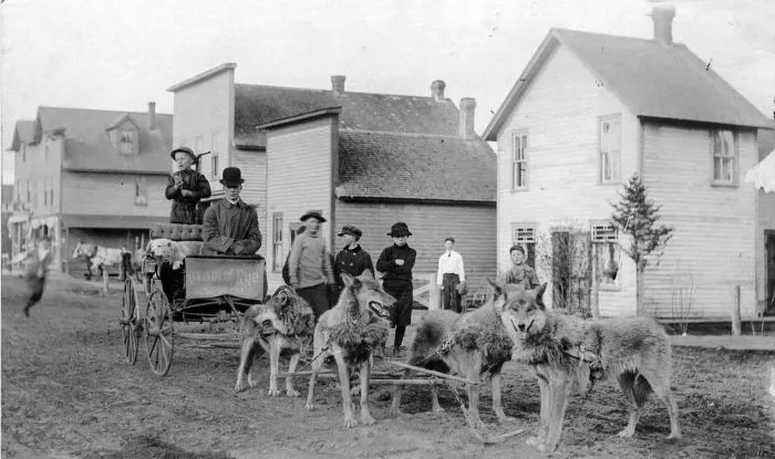 Ездовые волки, выращенные с щенков, запряжены в повозку. США, 1890-е годы