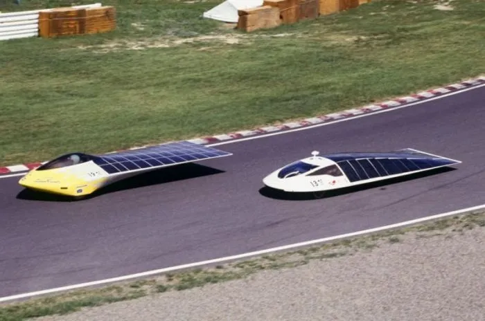 Солнцемобили Nissan Sun Favor и Kyocera Son of Sun соревнуются на трассе в Сузуке, Япония, 11 августа 1992 год