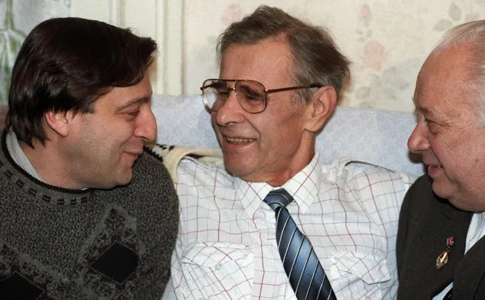 Артист эстрады Геннадий Хазанов, советский футболист Лев Яшин и спортивный комментатор Николай Озеров, 1990 год