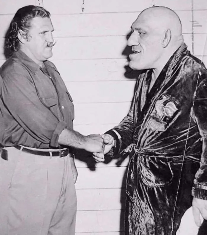 Уильям Стейг, создатель Шрека, с профессиональным рестлером Морисом Тилле, который был источником персонажа. 1940-е года