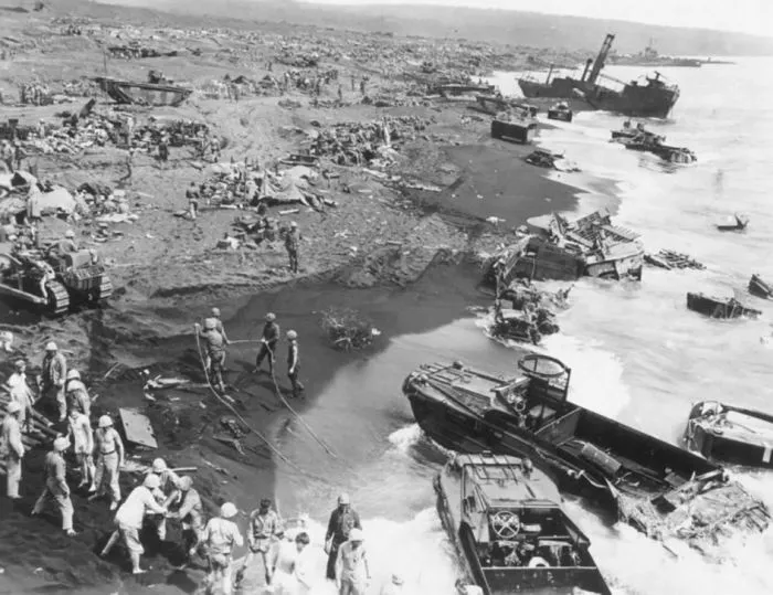 Выгрузка морской пехотой США снаряжения на острове Иводзима. Вторая мировая, февраль 1945 год