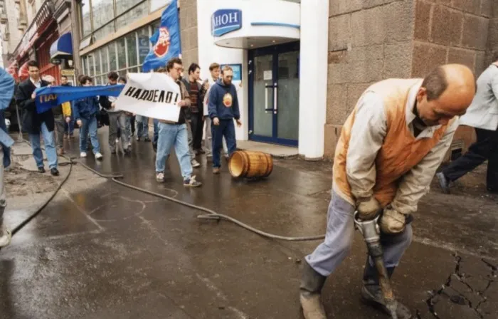 Водители такси, перекрывшие движение в центре Перми с требованием от городских властей обеспечения их безопасности, снижения плана, своевременных поставок запчастей. Поводом послужило ограбление и убийство их товарища-таксиста. 1992 год.