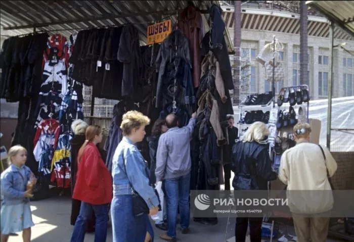Покупатели на вещевом рынке в Лужниках. Москва, 1997 год.