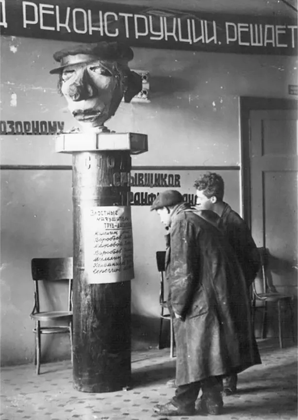 8. Позорный столб с фамилиями нарушителей дисциплины на ст. Ховрино. Московская область, 1932 год